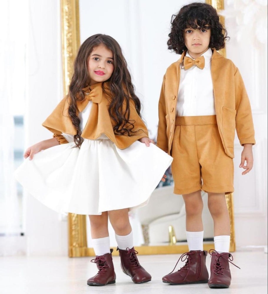 • يتمتع الطقم بألوان البيج والسكري، وهما ألوان محايدة تناسب جميع ألوان البشرة وتضفي مظهرًا دافئًا وأنيقًا على الأخ والأخت.