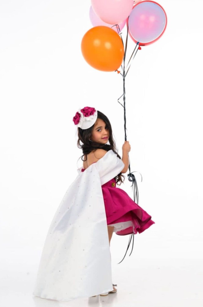 • هل تبحثين عن فستان ساحر لطفلتك الصغيرة يجعلها تشعر وكأنها أميرة حقيقية؟ إليكِ فستان فوشي ساحر بذيل أبيض ينساب بخفة خلفها، مثالي لأي مناسبة خاصة.